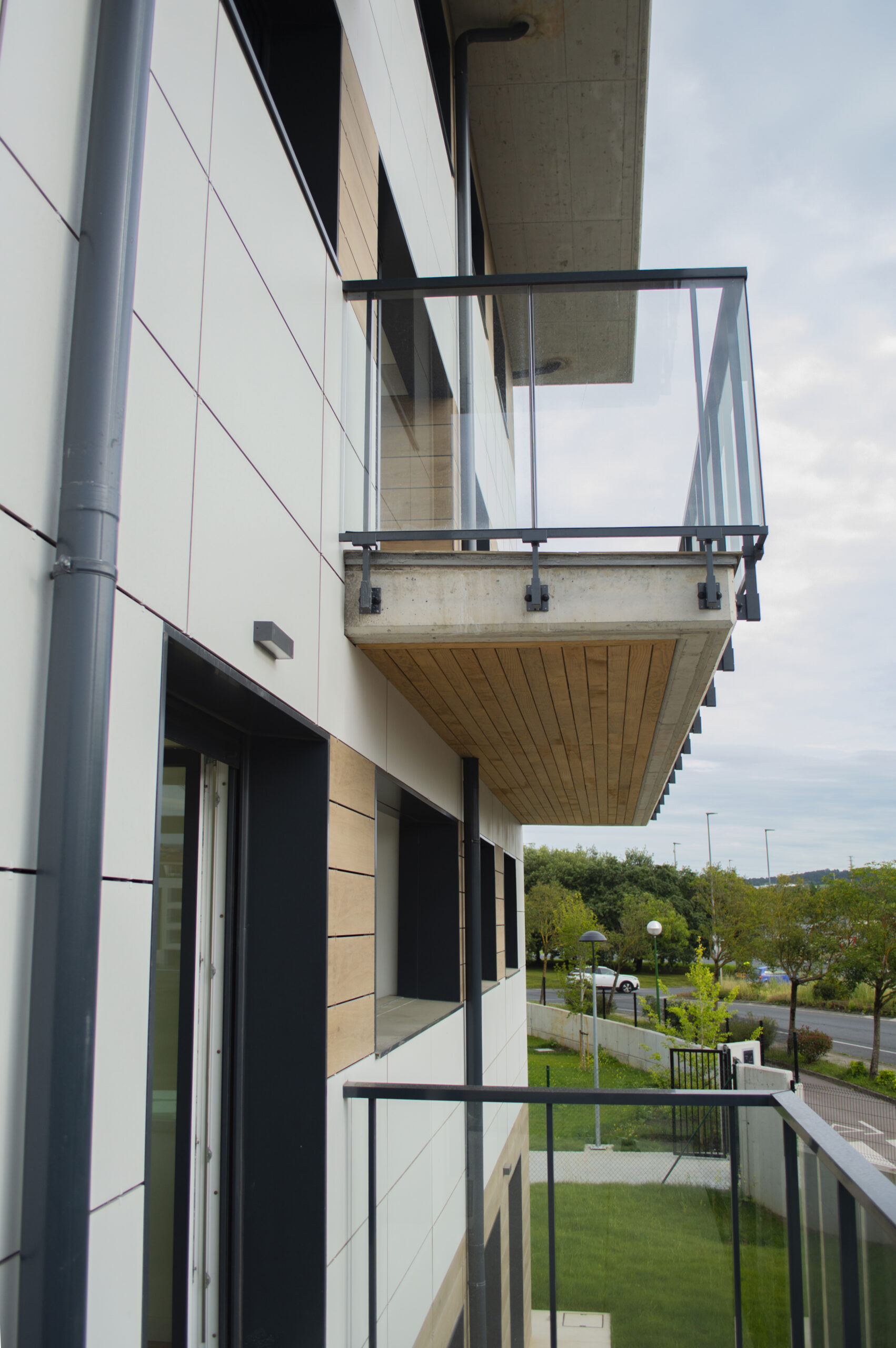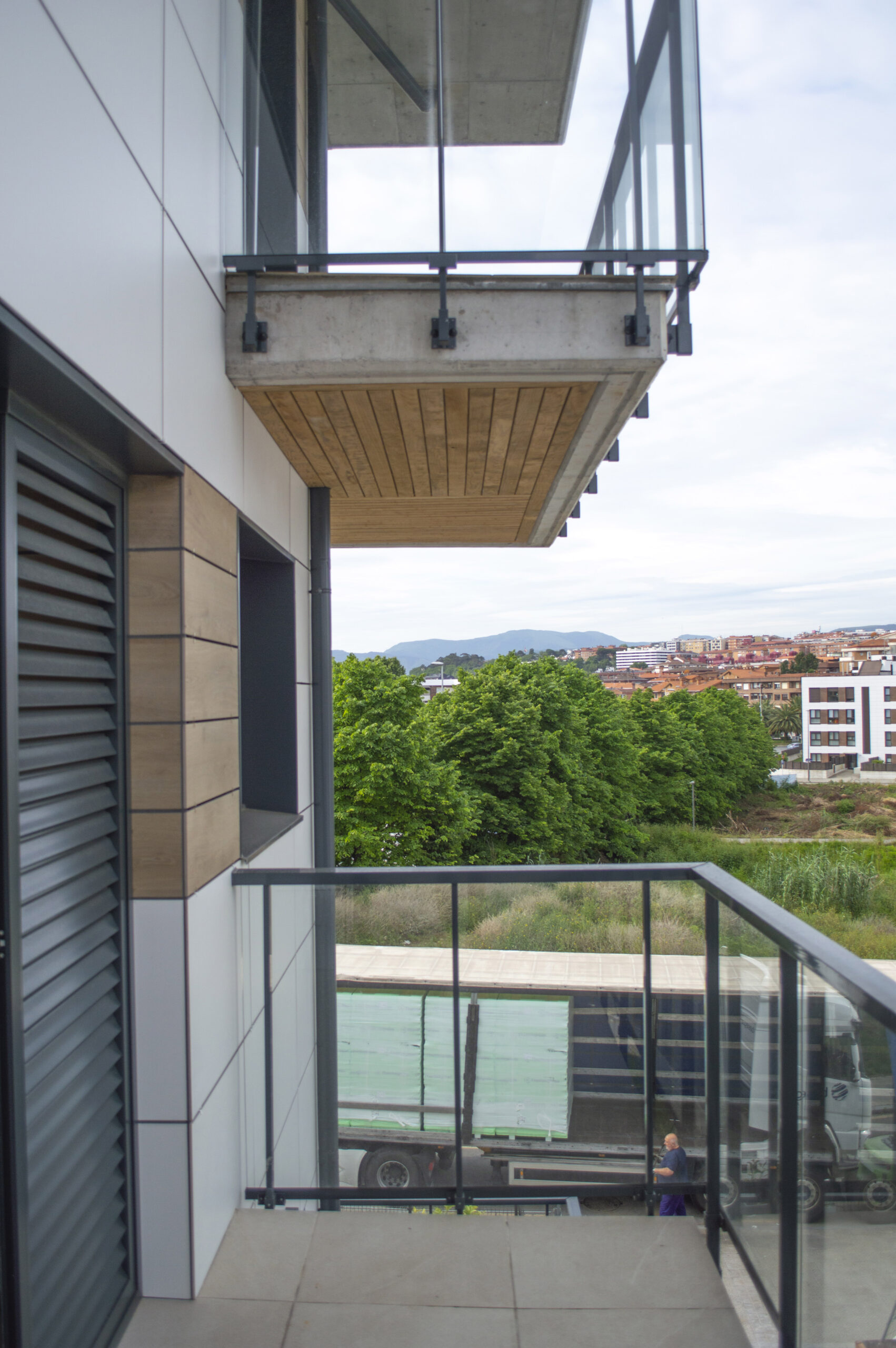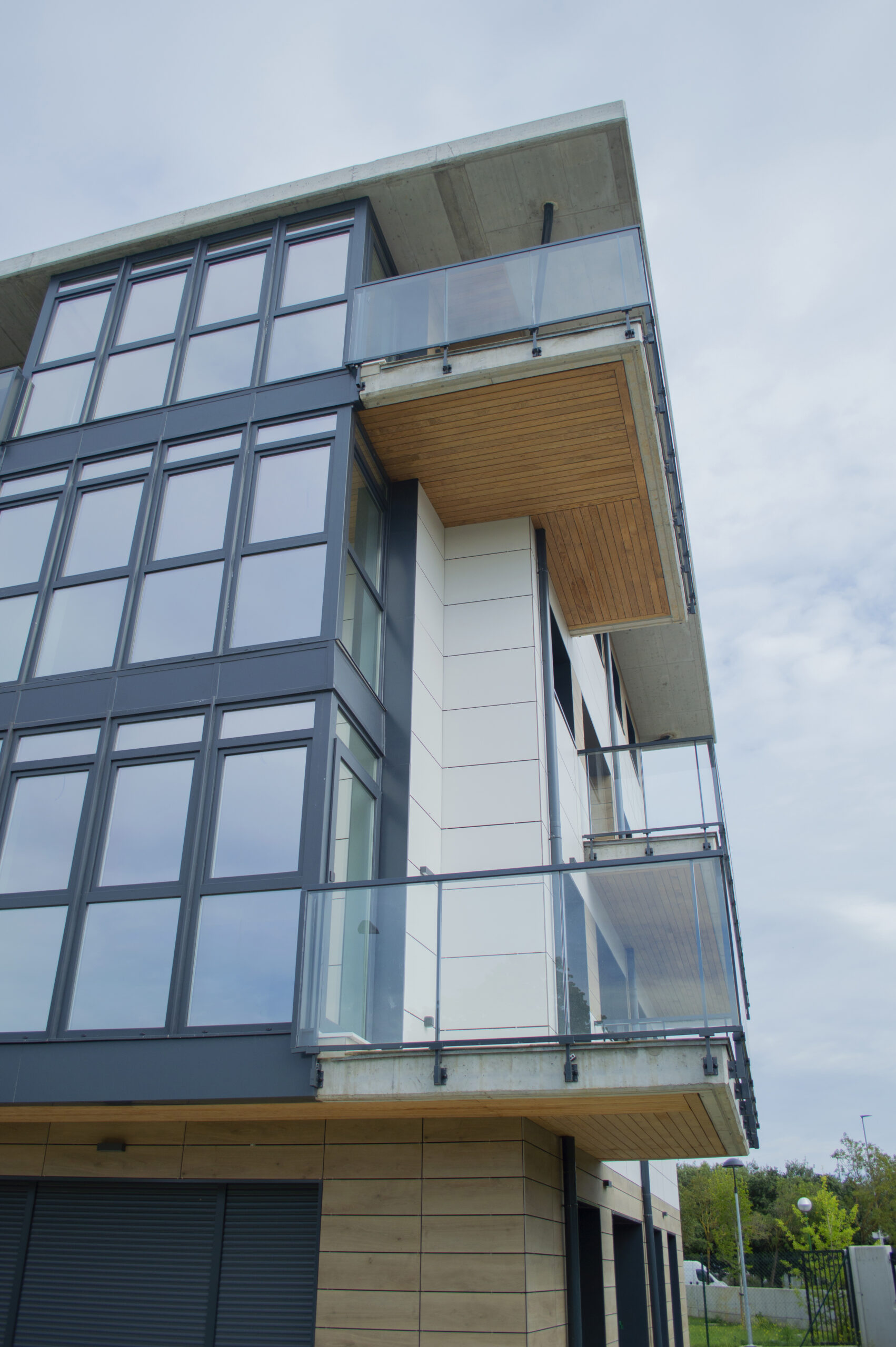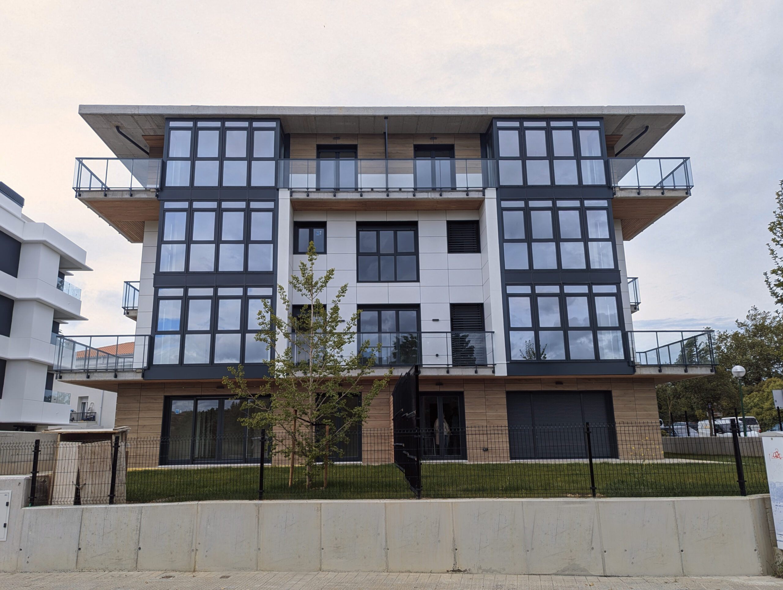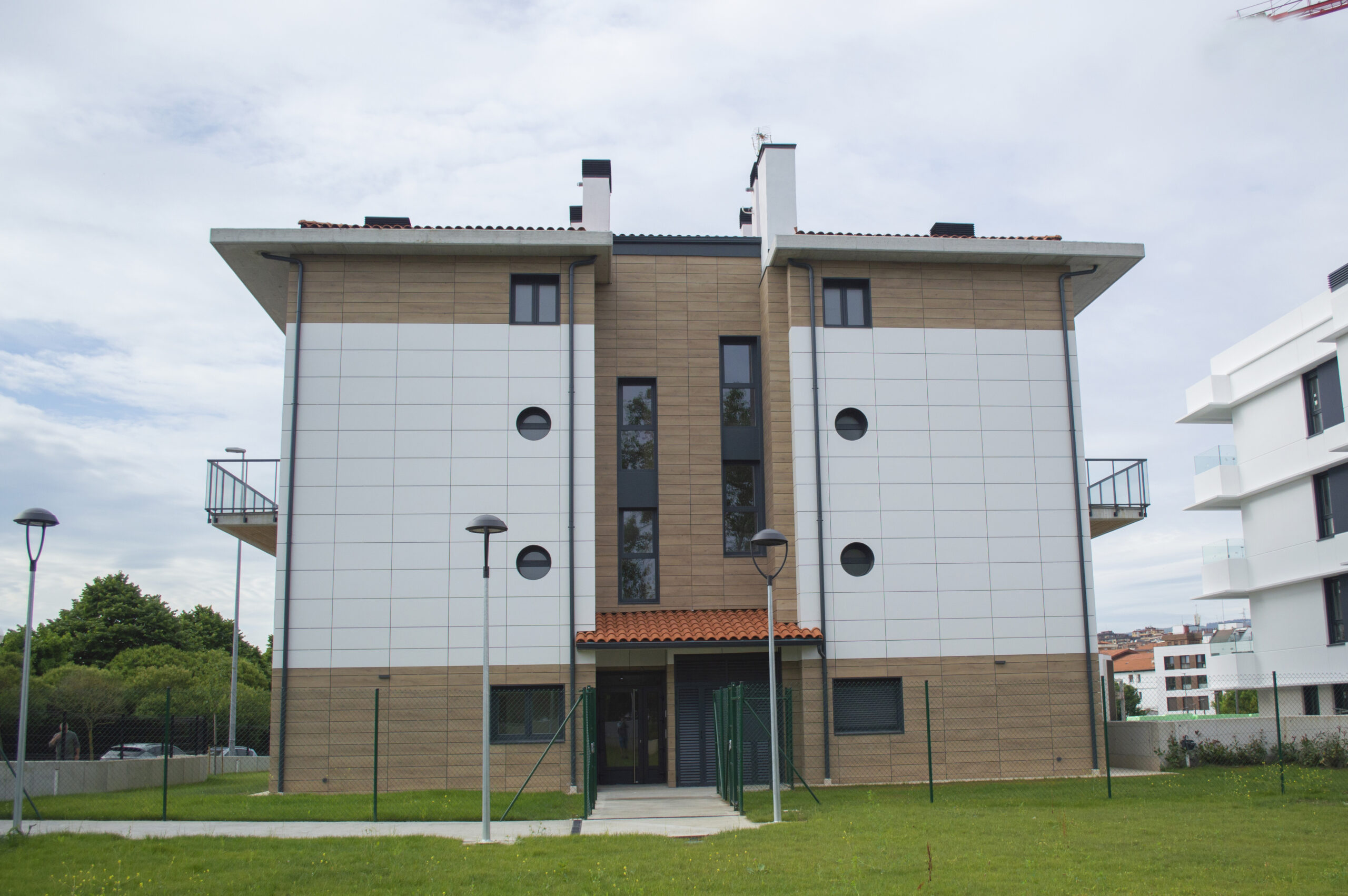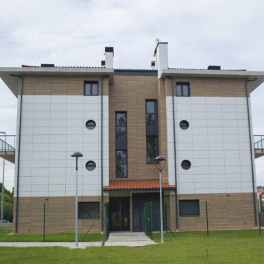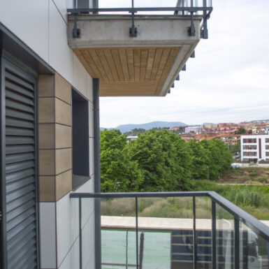 Beste aldetik batetik, kanpoko irudian, akaberak eraikinaren eskalari moldatzen saiatu gara, bolumetria konpaktua terrazen eta estalkiaren boladizoarekin apurtuz. Akaberetan, hormigoiaren eta zeramikaren elementu neutroak, itxura beroagoa dutenekin konbinatzen dira, fatxaden egur imitazioa edo terrazen sabaien zur natural termotratatuarekin.